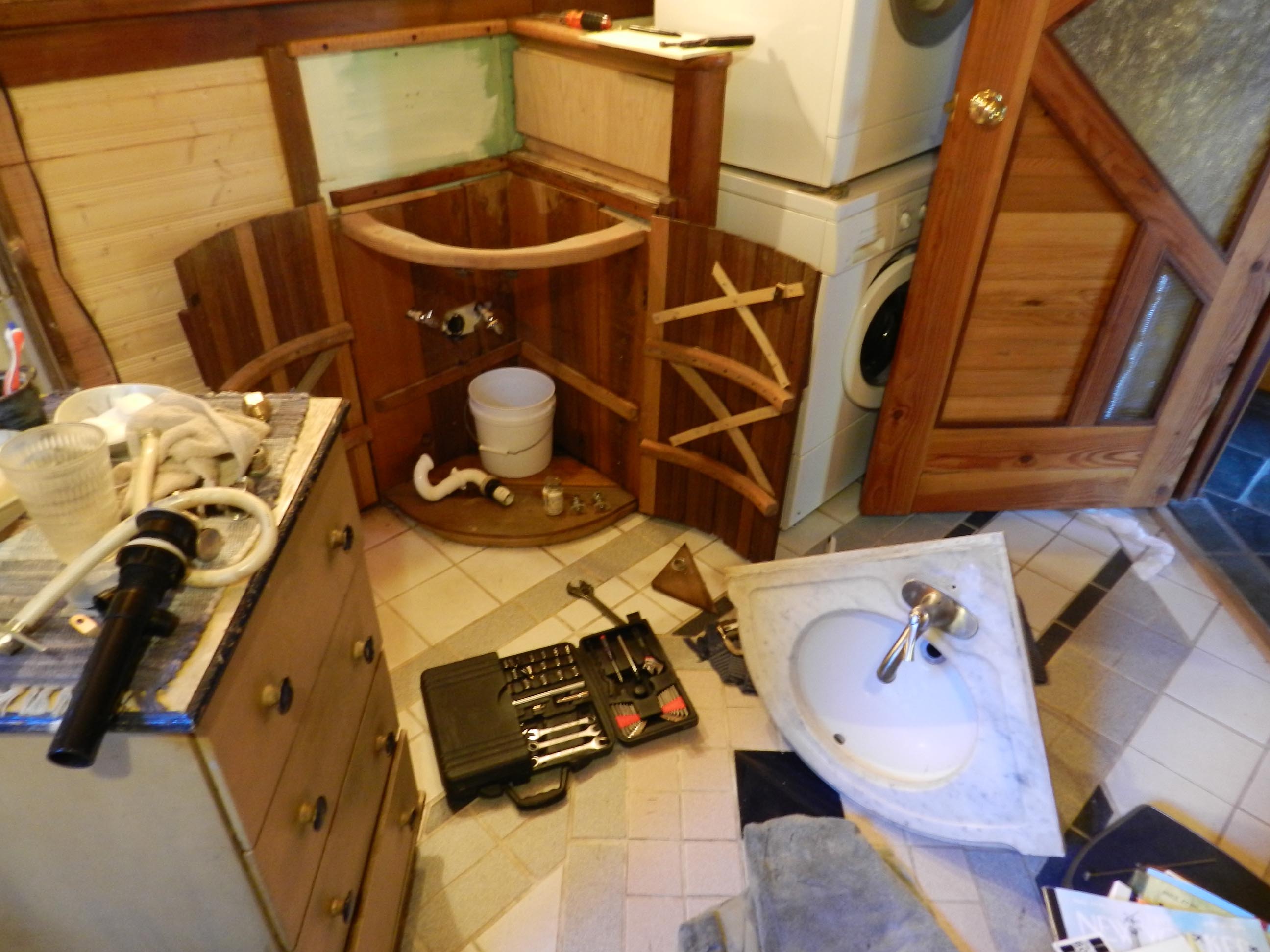 I’m going to spare you the minutiae of 3 days in the hellhole of my downstairs bathroom. I’m going to skip the part where I ended up pulling the entire sink out, marble base and all. I’m going to simply tell you I made 4 trips, not 3, to the nearest hardware store for new supply lines, cut-off valves and various other parts that wouldn’t fit with the new fancy Kohler. I’m going to jump straight to the day, a few days down the pike, when I reinstalled the sink with the gleaming Kohler faucet glinting a golden light from its elegant and stylish neck, turned the tap and … a measley flow of water flowed from its mouth.
